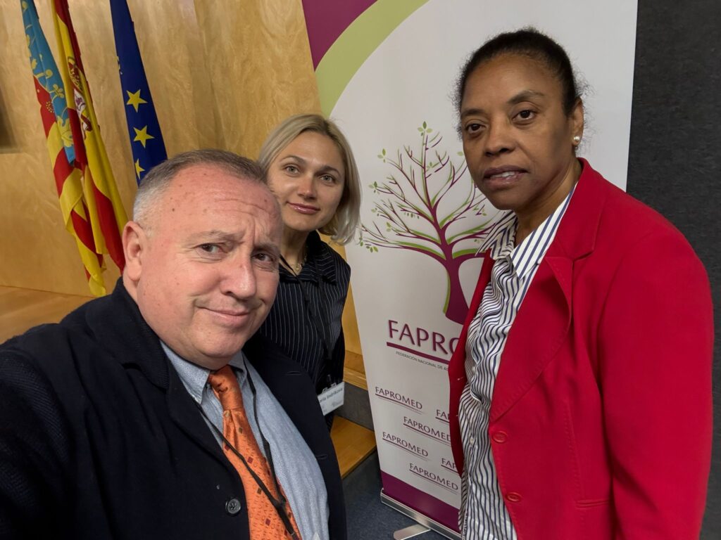 Daría Indrikova y Porfirio Javier Rodríguez de Ouroboros con Urbania Rondón presidenta de FAPROMED (Federación Nacional de Asociaciones de Profesionales de la Mediación) y organizadora del VII Congreso Nacional de Mediación celebrado en Alicante junto a la Facultad de Derecho de la UA.